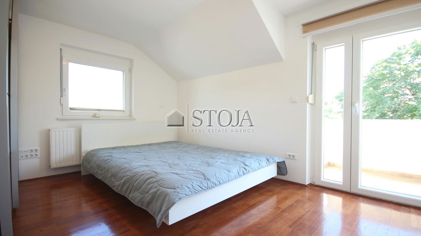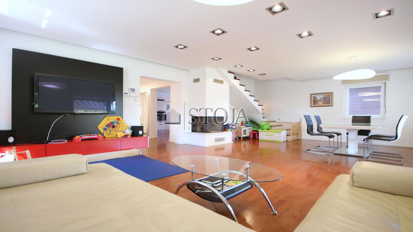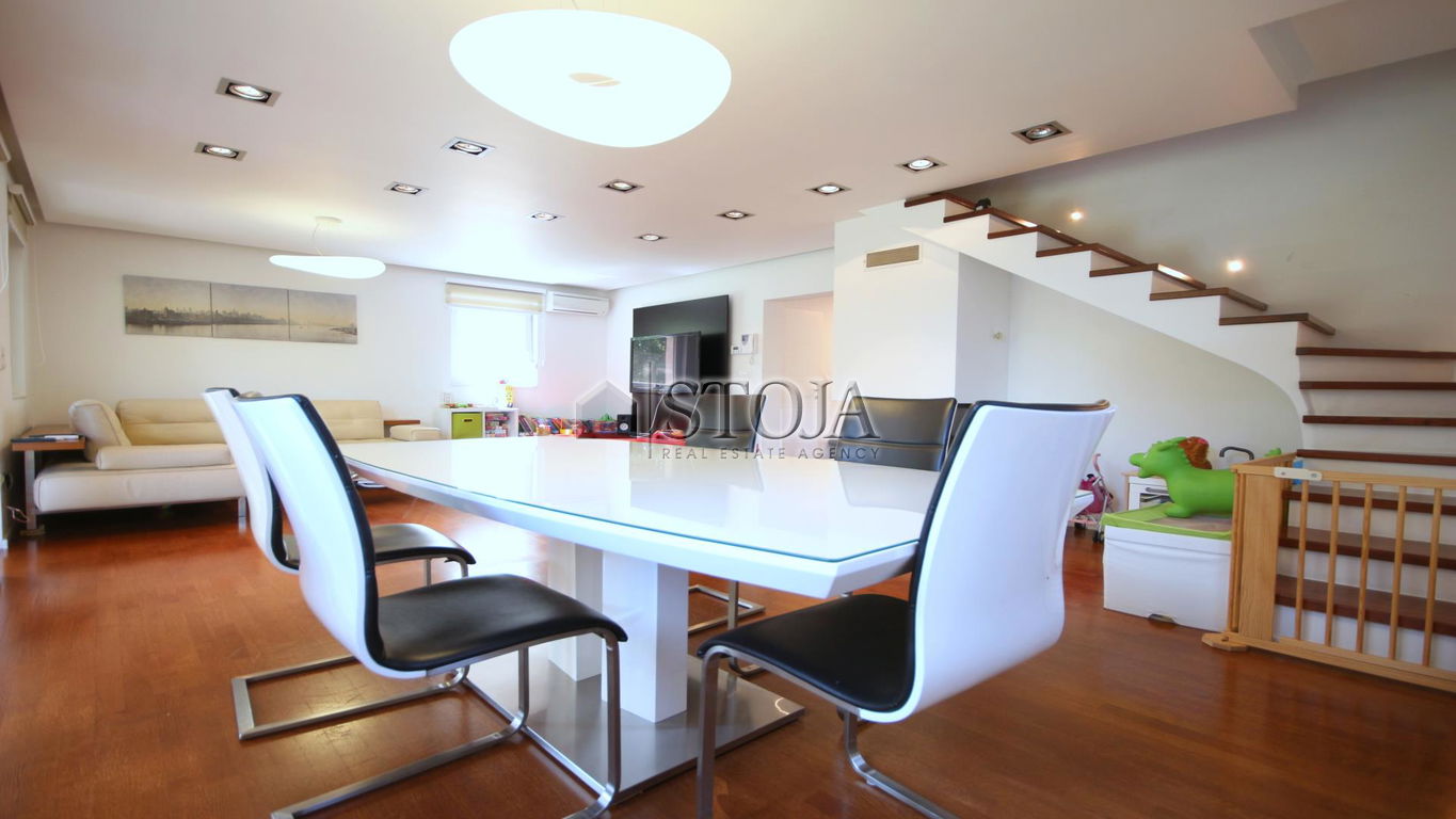 The functional layout includes the ground floor, where the main entrance, bathroom, spacious kitchen, storage room, and a large living room with a fireplace and access to a sunny terrace (approx. 40 m²) with an open grill are located. On the upper floor, there is the master bedroom, two youth rooms with access to a shared balcony, a utility room, and a bathroom. The attic offers the possibility of a separate apartment or office space, as it consists of two larger open-plan rooms (each approx. 20 m²), one currently used as a gym, the other as a dressing room. The attic is equipped with all installations for a kitchen and bathroom, as well as a separate storage area.
