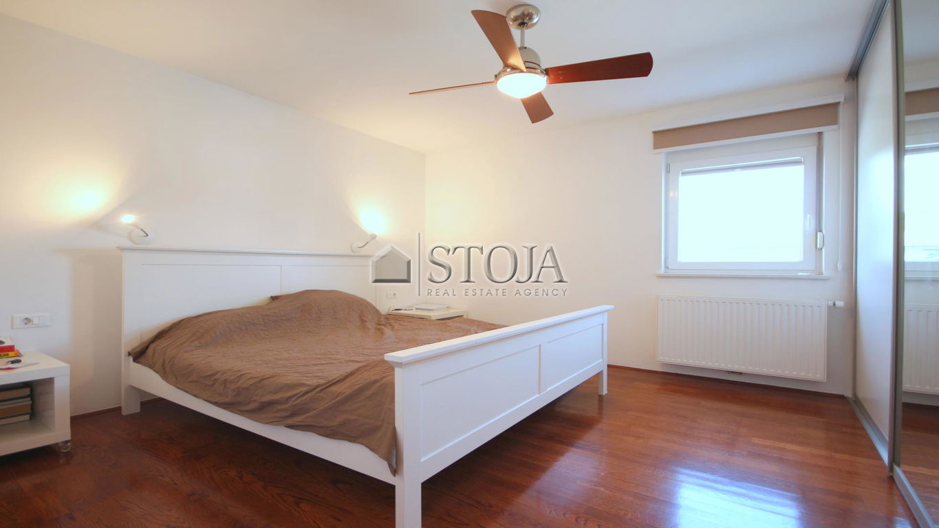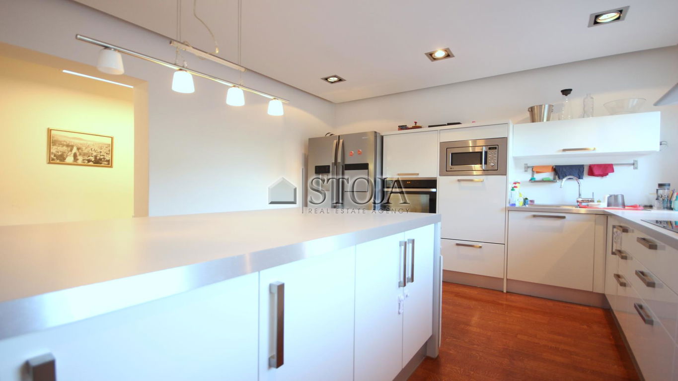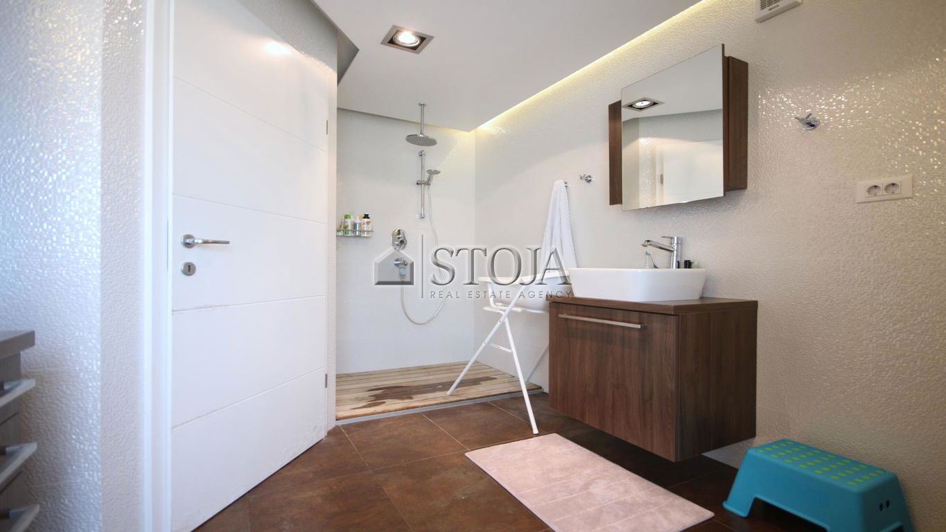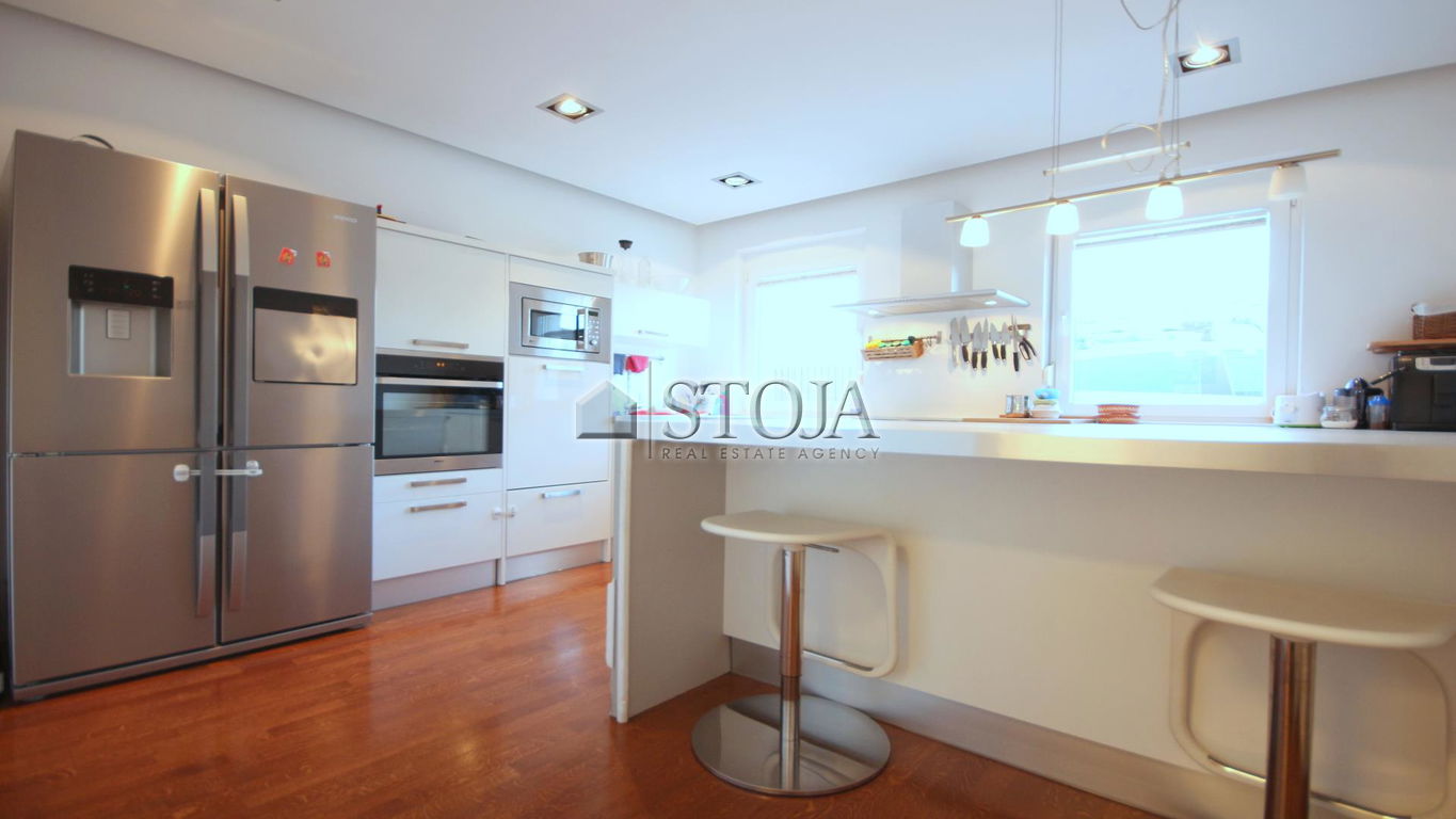 The functional layout includes the ground floor, where the main entrance, bathroom, spacious kitchen, storage room, and a large living room with a fireplace and access to a sunny terrace (approx. 40 m²) with an open grill are located. On the upper floor, there is the master bedroom, two youth rooms with access to a shared balcony, a utility room, and a bathroom. The attic offers the possibility of a separate apartment or office space, as it consists of two larger open-plan rooms (each approx. 20 m²), one currently used as a gym, the other as a dressing room. The attic is equipped with all installations for a kitchen and bathroom, as well as a separate storage area.