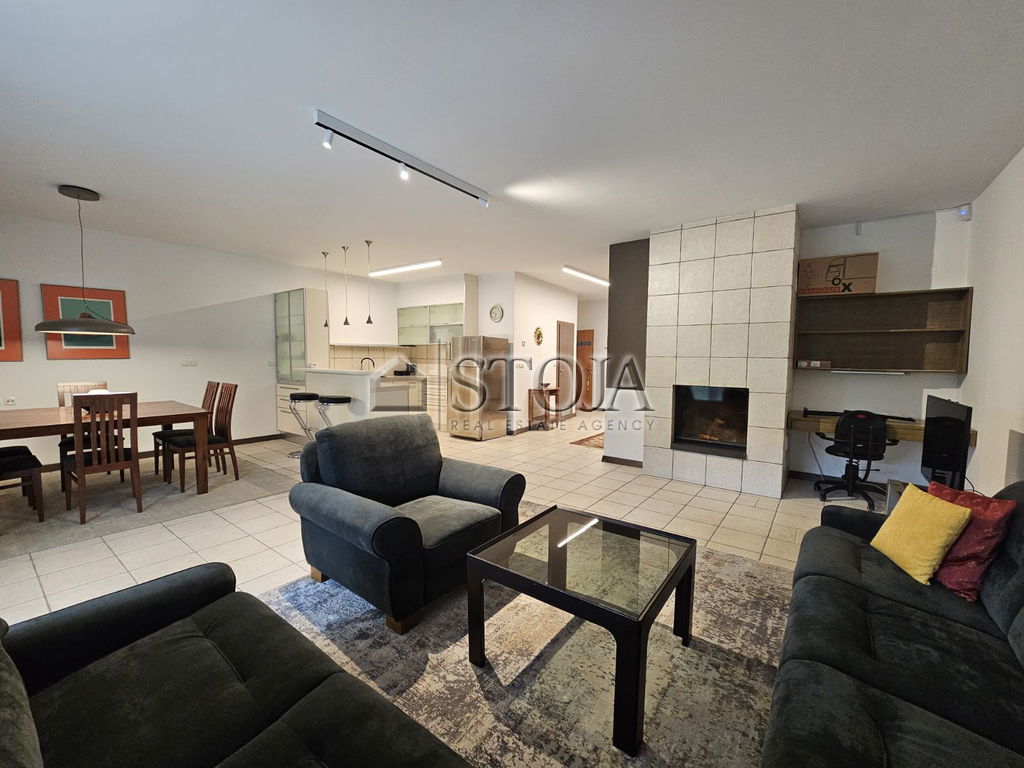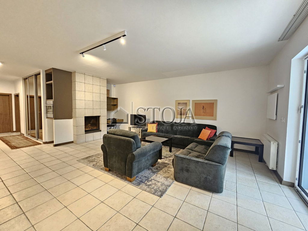 • odprt bivalno-kuhinjski prostor s kaminom in izhodom na balkon, odprto teraso ter atrij,