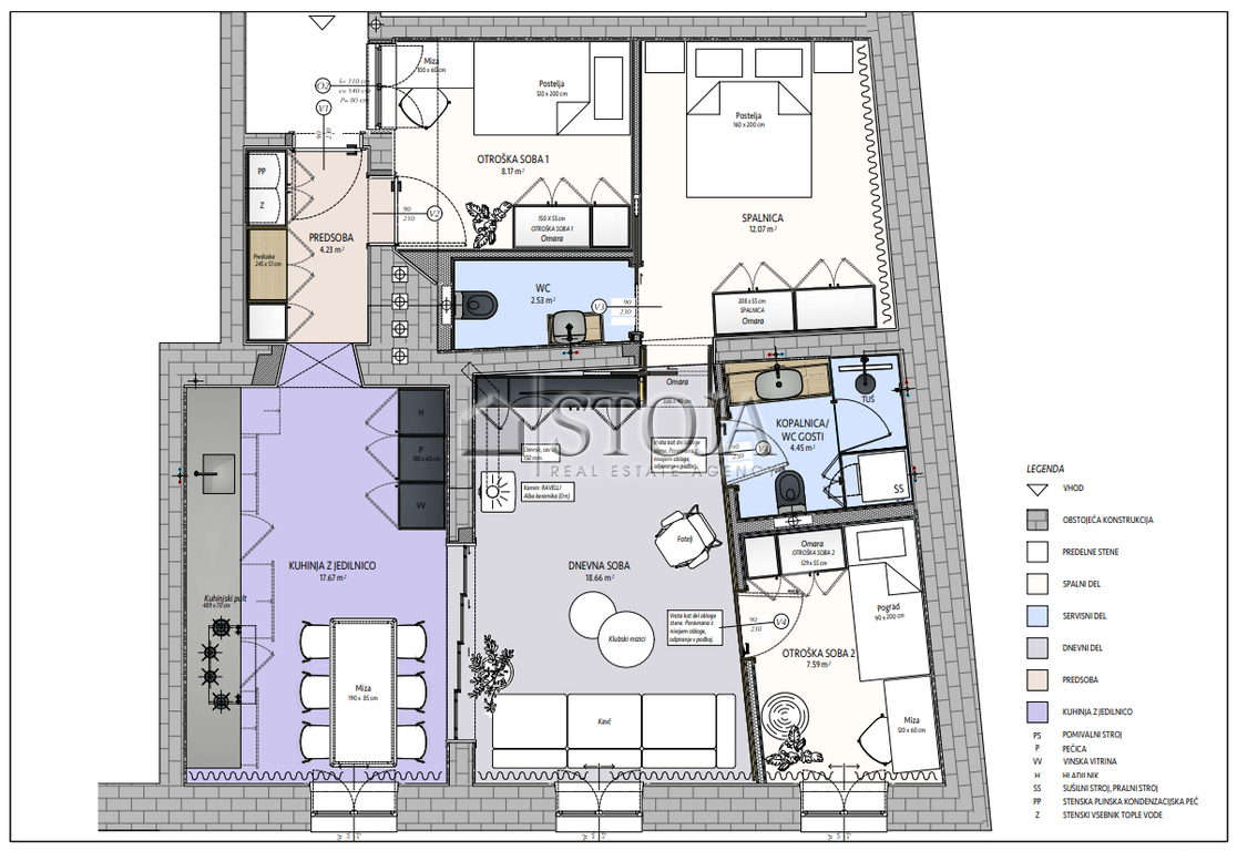 The functional layout includes a hallway with a wardrobe, a youth room, a kitchen with a dining area connected to the living room, an additional youth room, a bathroom with a laundry area, and a master bedroom (without a window) with its own bathroom. Currently, ventilation in the master bedroom is provided by a recuperator, but it is possible to install a window in the bedroom area, for which the seller has already obtained conditions from the Institute for Cultural Heritage.
