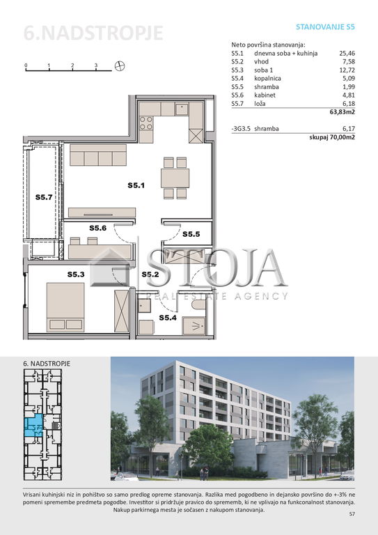 Stanovanje odlikuje odličen tloris in prijetna razporeditev prostorov, skupne površine 70,00 m². Obsega prostorno dnevno sobo s kuhinjo (25,46 m²), spalnico (12,72 m²), kabinet (4,81 m²), kopalnico in vhodni prostor (7,58 m²). Za sprostitev na prostem je na voljo loža (6,18 m²), ki nudi prijeten razgled in svetlobo skozi ves dan.