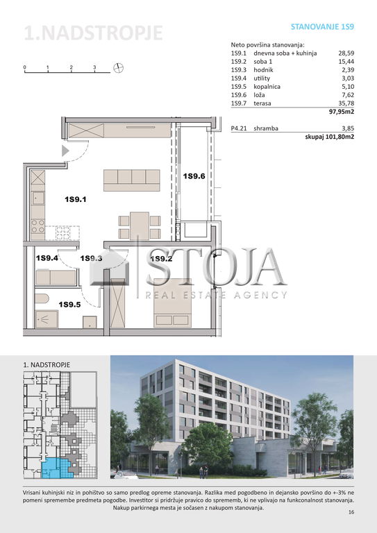 The space has a total area of 101.80 m² and is designed to be functional and bright, allowing comfortable living or working. It includes a living room with kitchen (28.59 m²), a room (15.44 m²), utility room, bathroom, and hallway, additionally complemented by a loggia (7.62 m²) and a spacious terrace (35.78 m²), ideal for relaxation.
