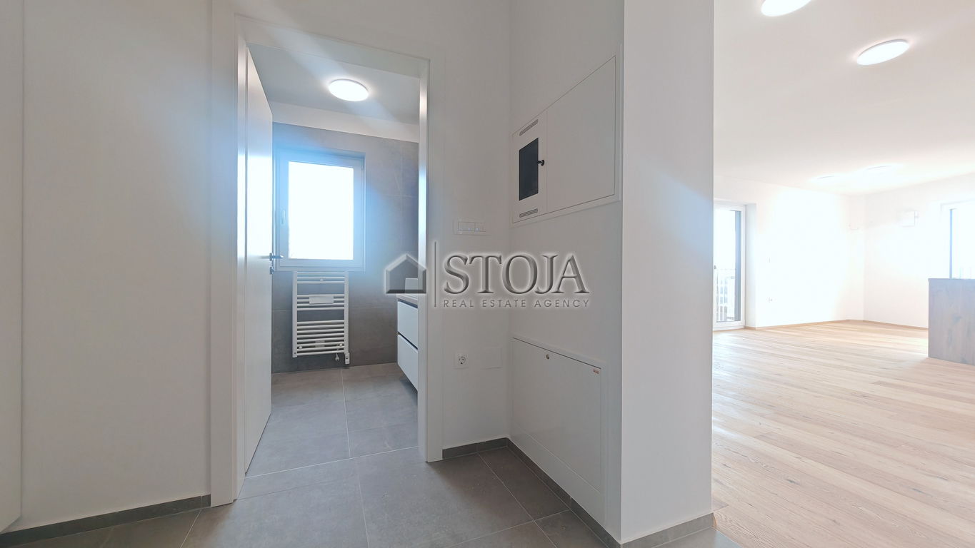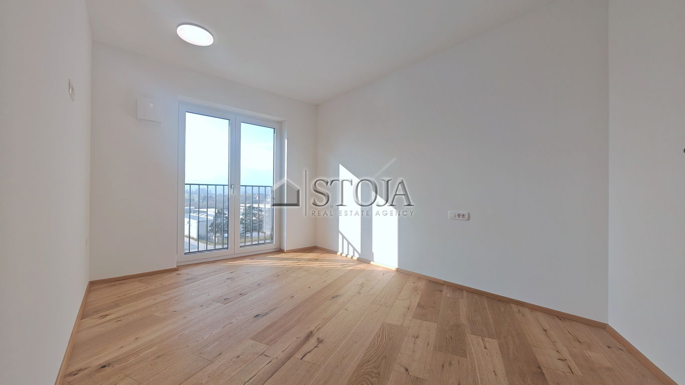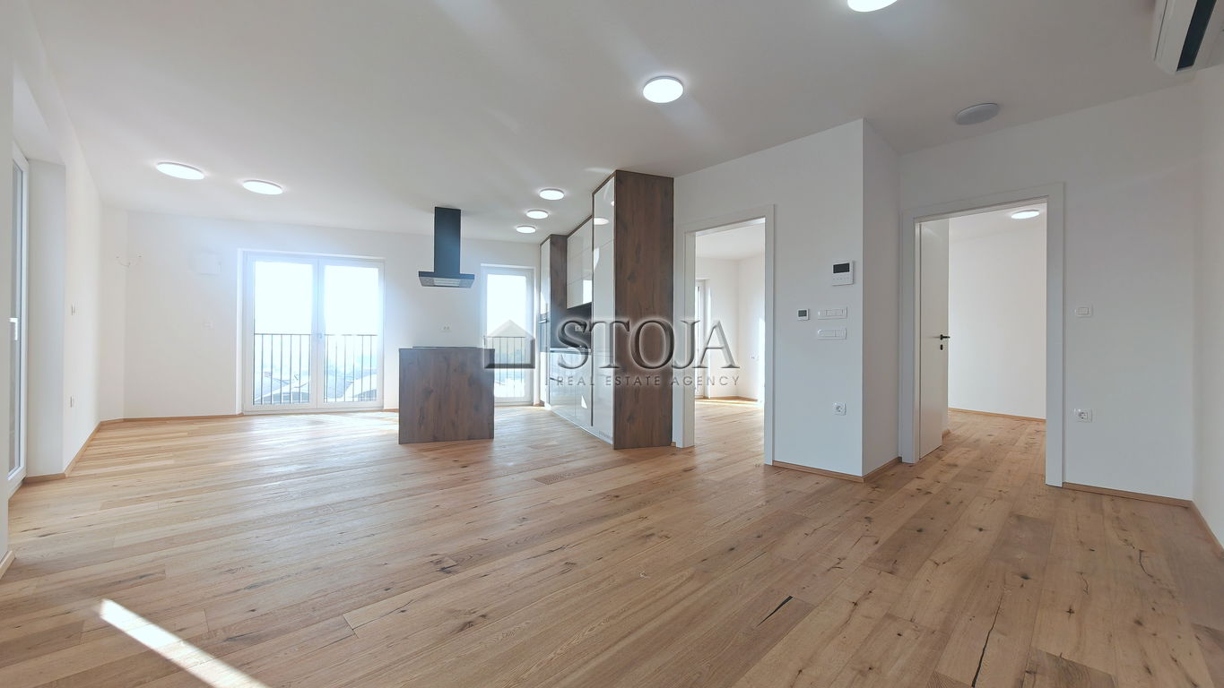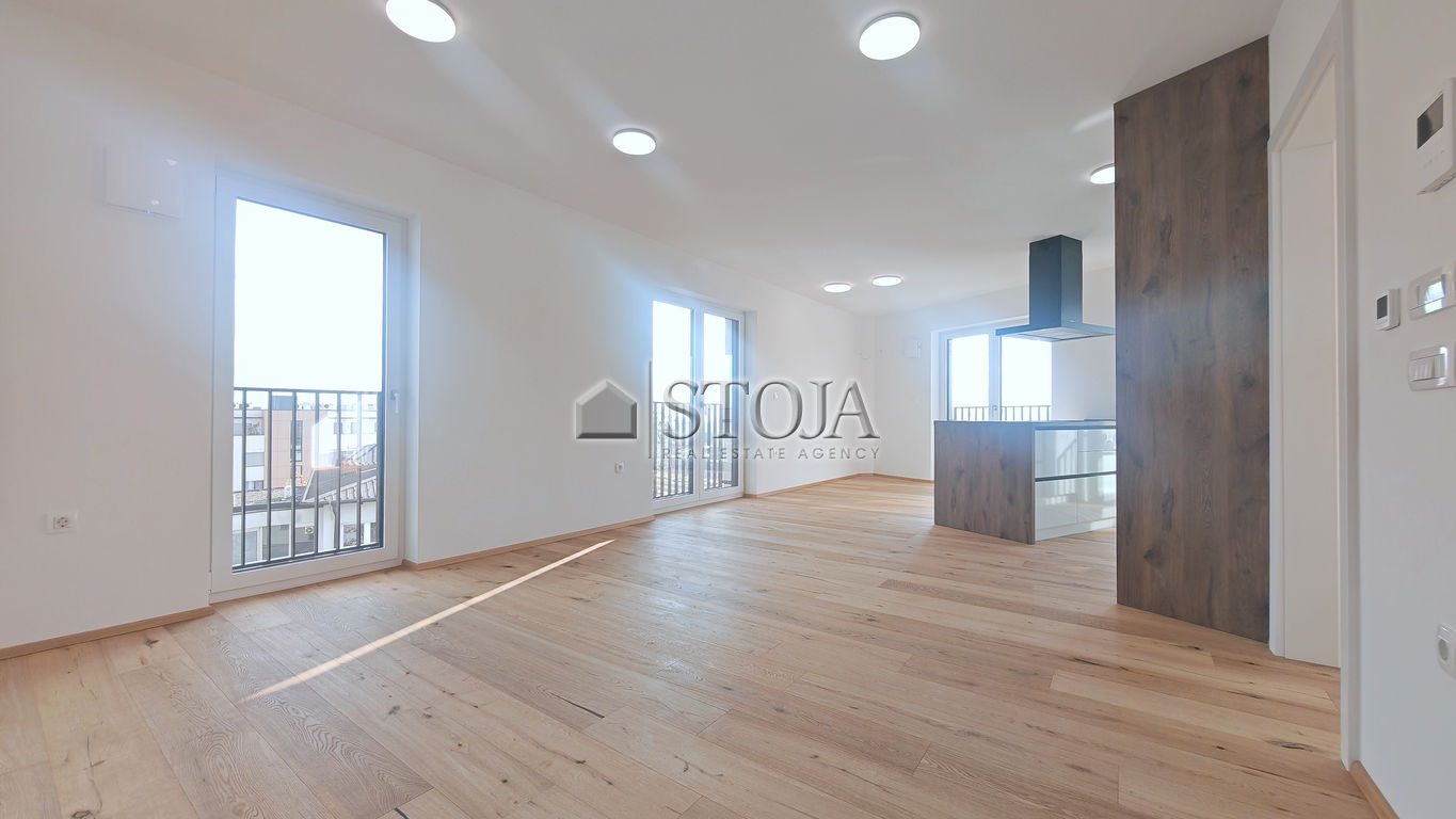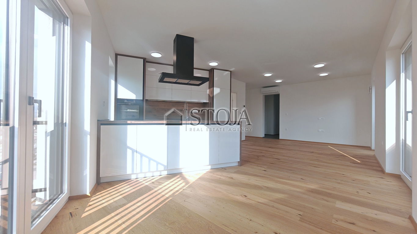 The apartment features its own heat pump and underfloor heating, spot ventilation with recuperation, a Mitsubishi air conditioning unit, panoramic 3-layer windows with electrically controlled blinds, Italian ceramics, wide-strip oiled oak parquet, anti-burglary entrance doors, and high ceilings (2.75 m).