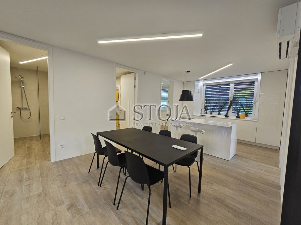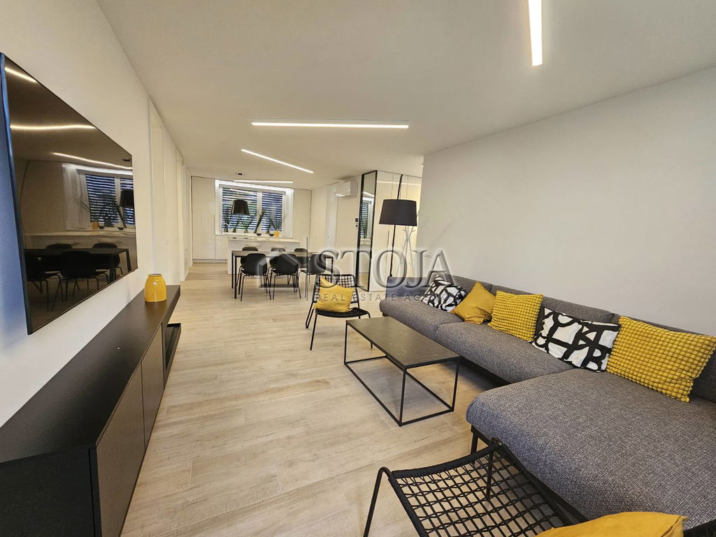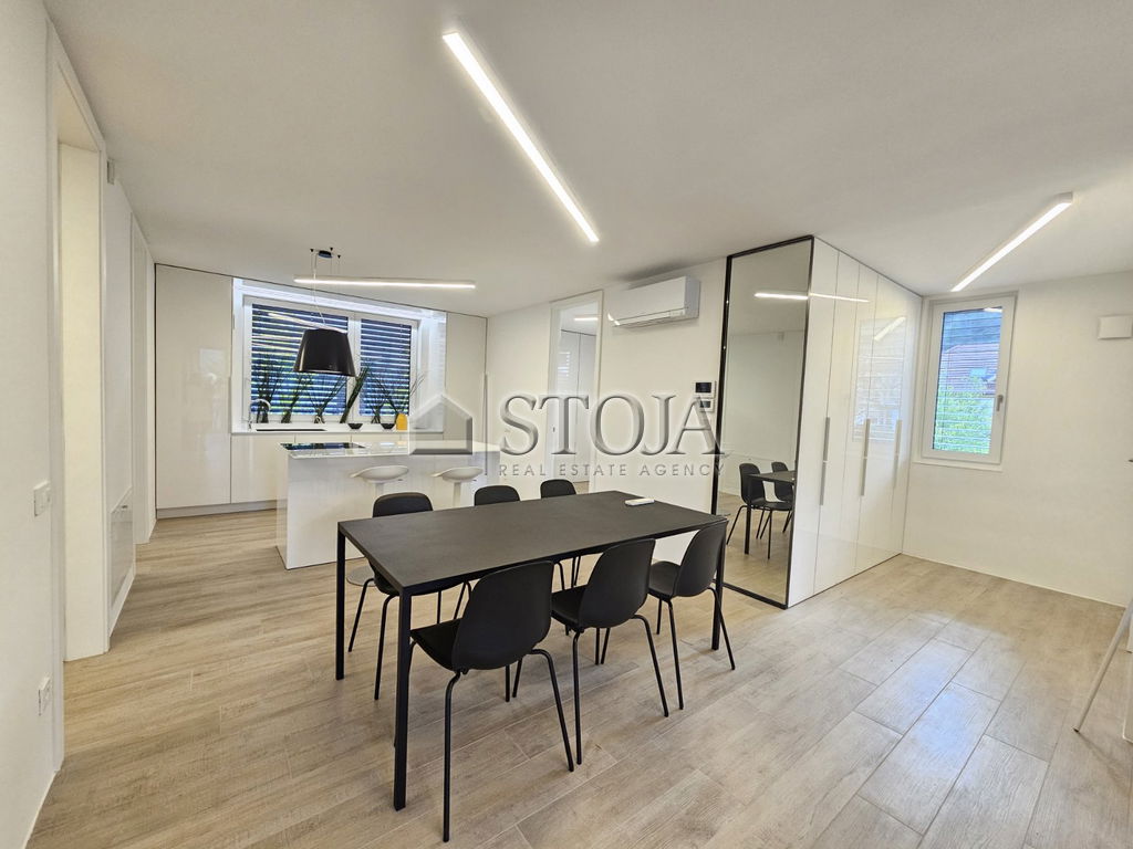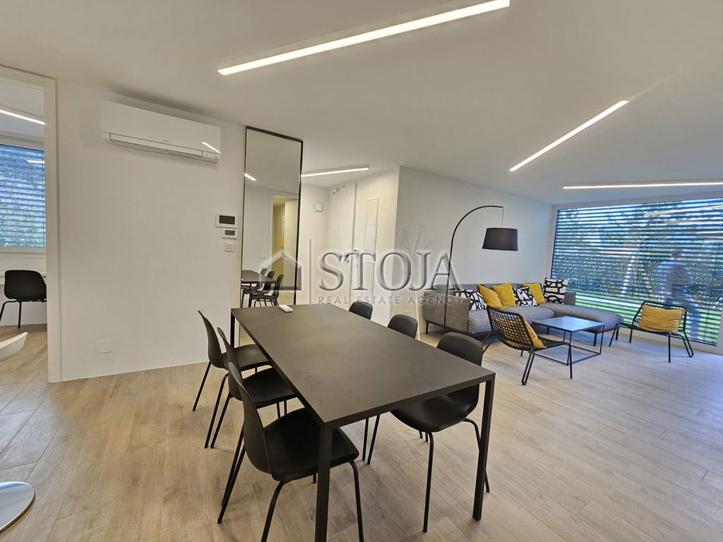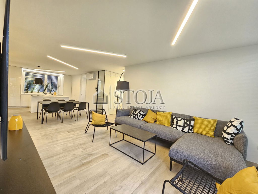 Prostoren, enovit bivalni prostor, ki se preko velikih steklenih površin odpira na zasebni zeleni atrij s teraso (153 m²)