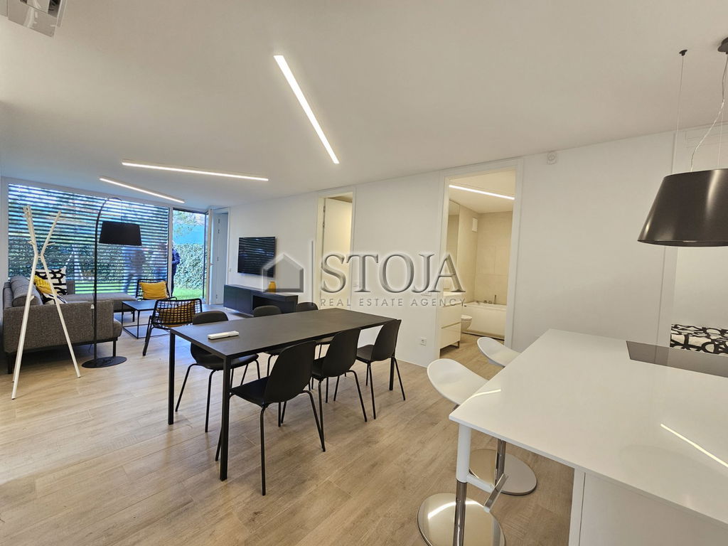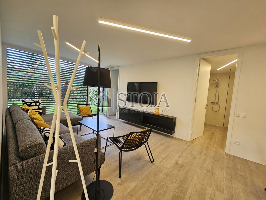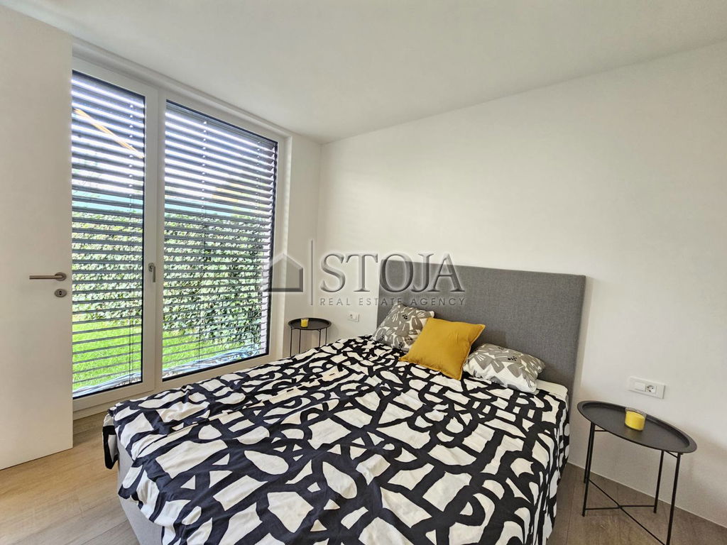 Na mirni zeleni lokaciji v Vižmarjah, na meji s Šentvidom, je na voljo sodobno zasnovano pritlično stanovanje z zasebnim zelenim atrijem in teraso. Stanovanje je v celoti opremljeno s kuhinjskimi aparati in pohištvom, zato omogoča takojšnjo vselitev.