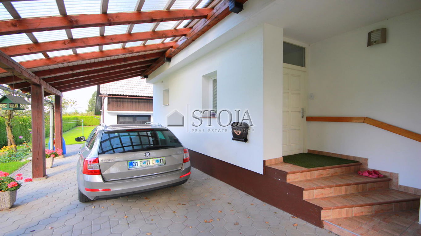 Pred hišo se nahaja nadstrešek za dva avtomobila, garaža ter zelenjavni vrt z manjšo zelenico.