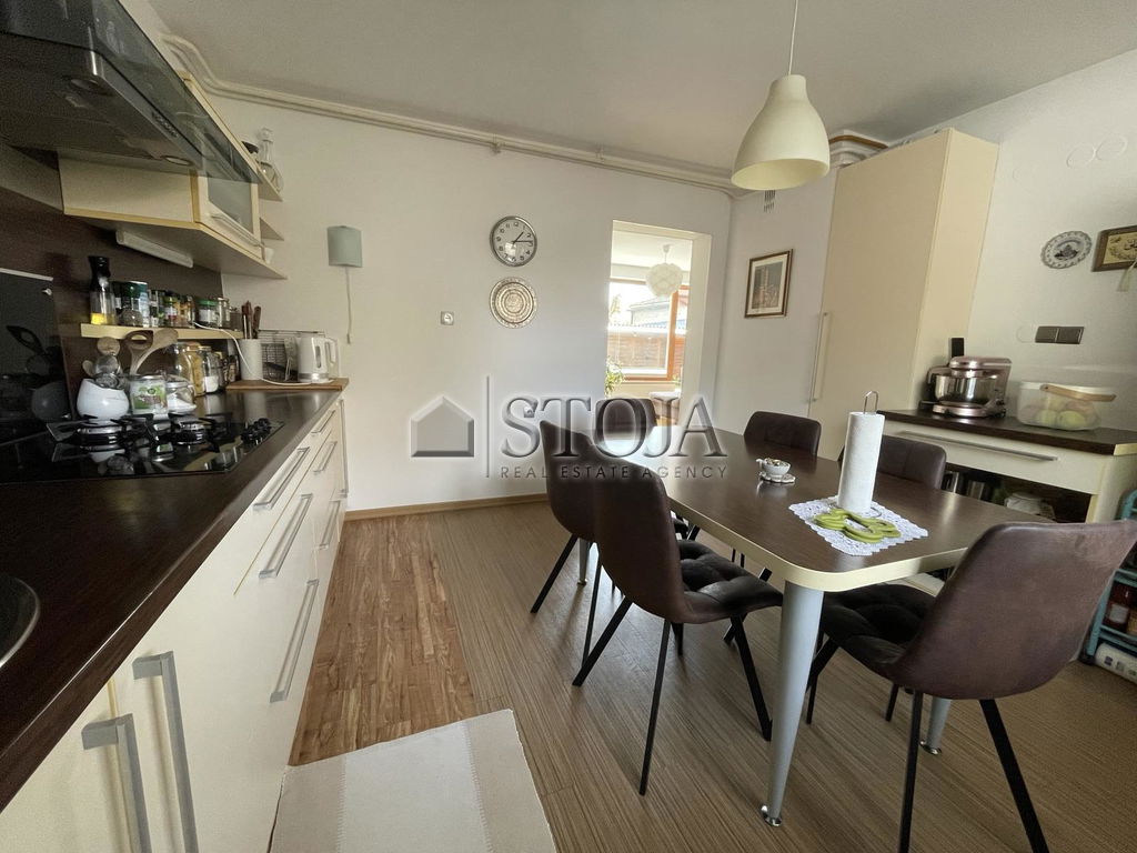 -izhod na lepo urejen atrij z letno kuhinjo – idealen kotiček za sprostitev ali druženje ob poletnih večerih. Dodatno udobje pa zagotavljajo shramba, zidana lopa ter lastno parkirišče ob hiši.