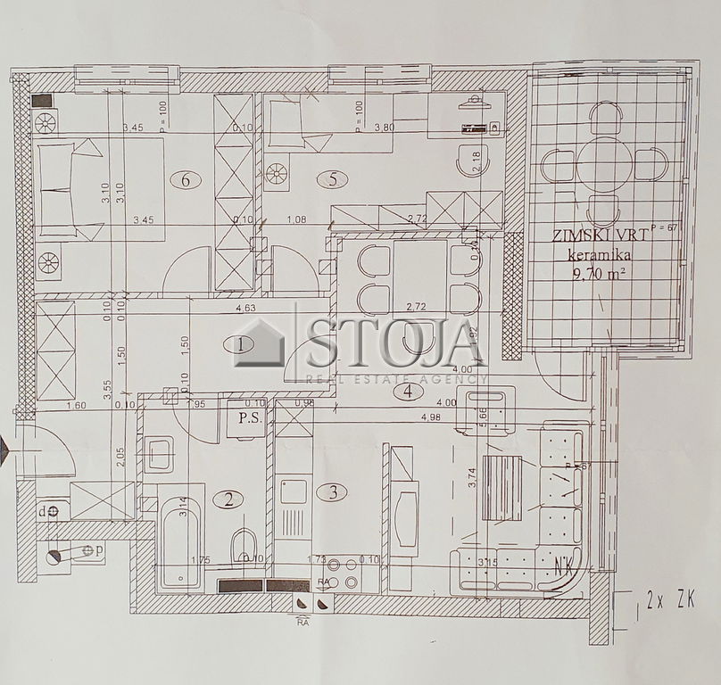 Funkcionalna razporeditev prostorov obsega predprostor z garderobo (10,2 m2), kopalnico (5,7 m2), glavno spalnico (10,6 m2), mladinsko sobo (9,3 m2) ter velik dnevno bivalni prostor (17,8 m2) s kuhinjo in jedilnico z izhodom na zimski vrt.