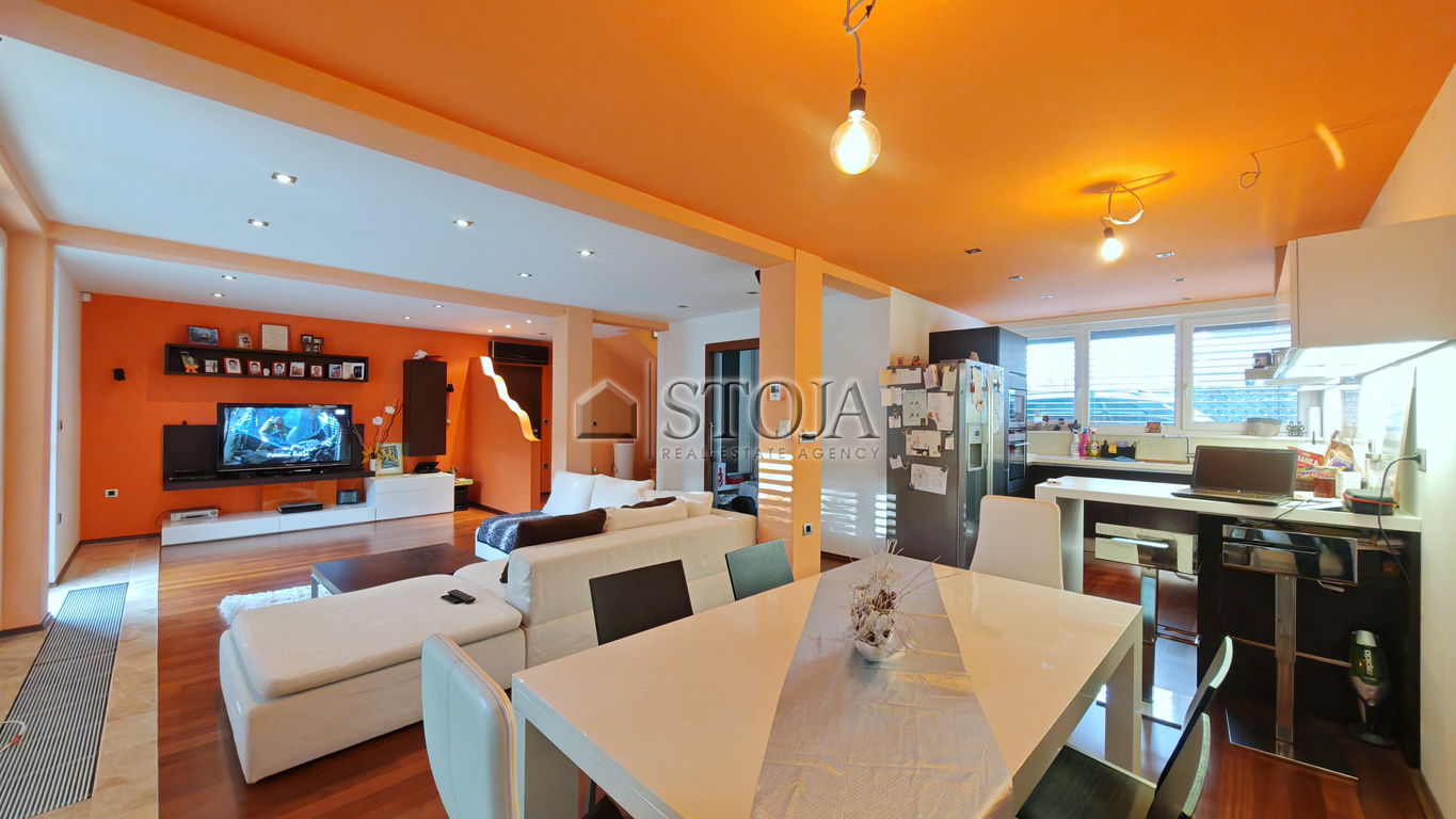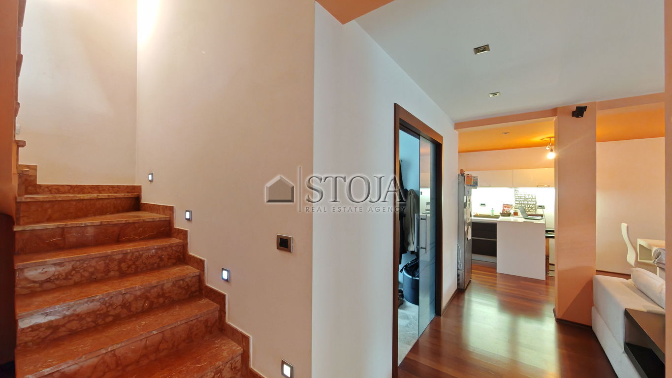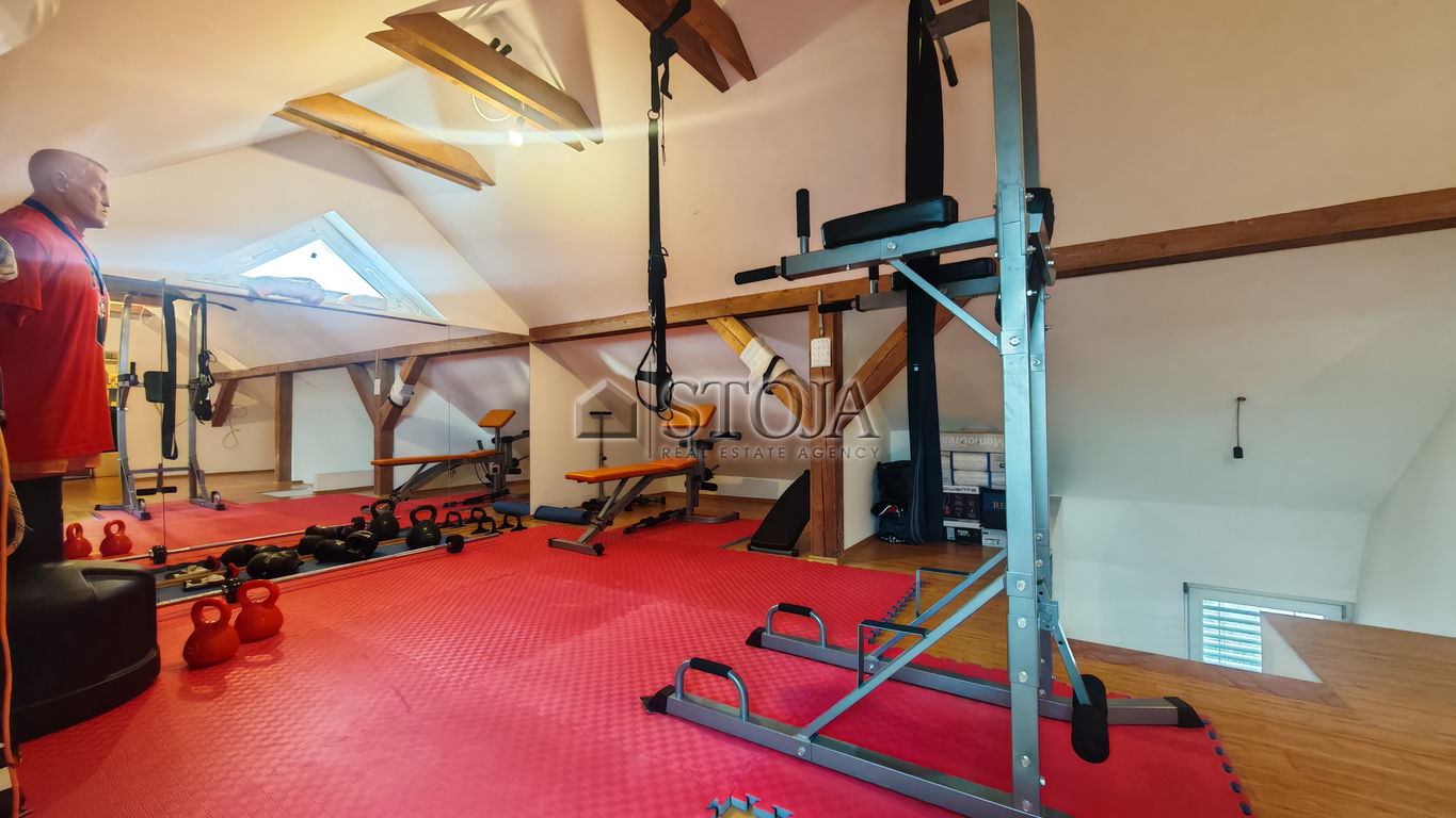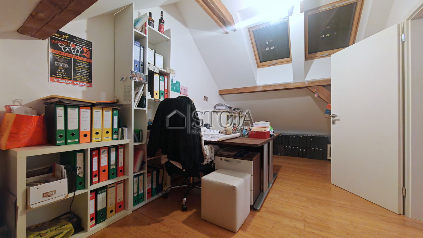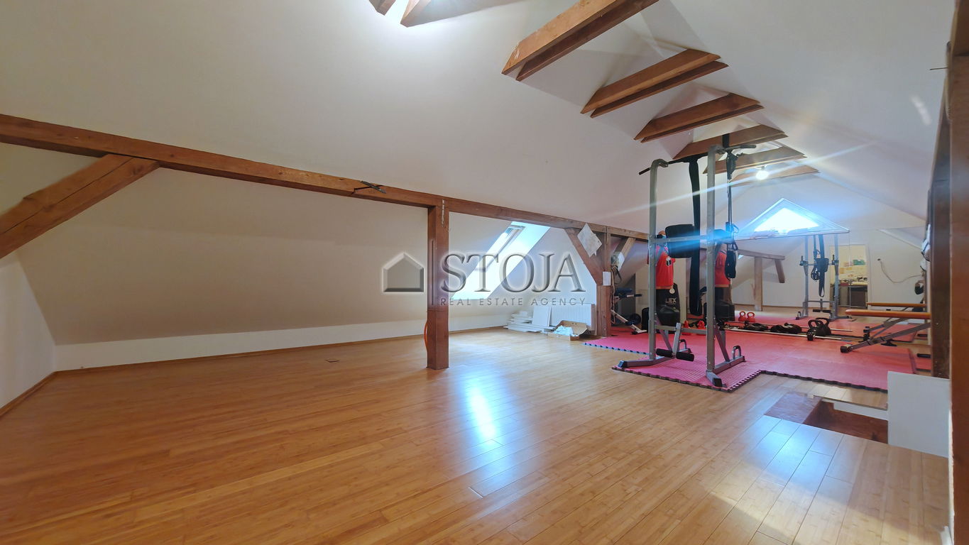 Mansarda obsega večji prostor odprtega tipa, ki trenutno služi kot fitnes ter dodatna soba, ki se uporablja kot pisarna.