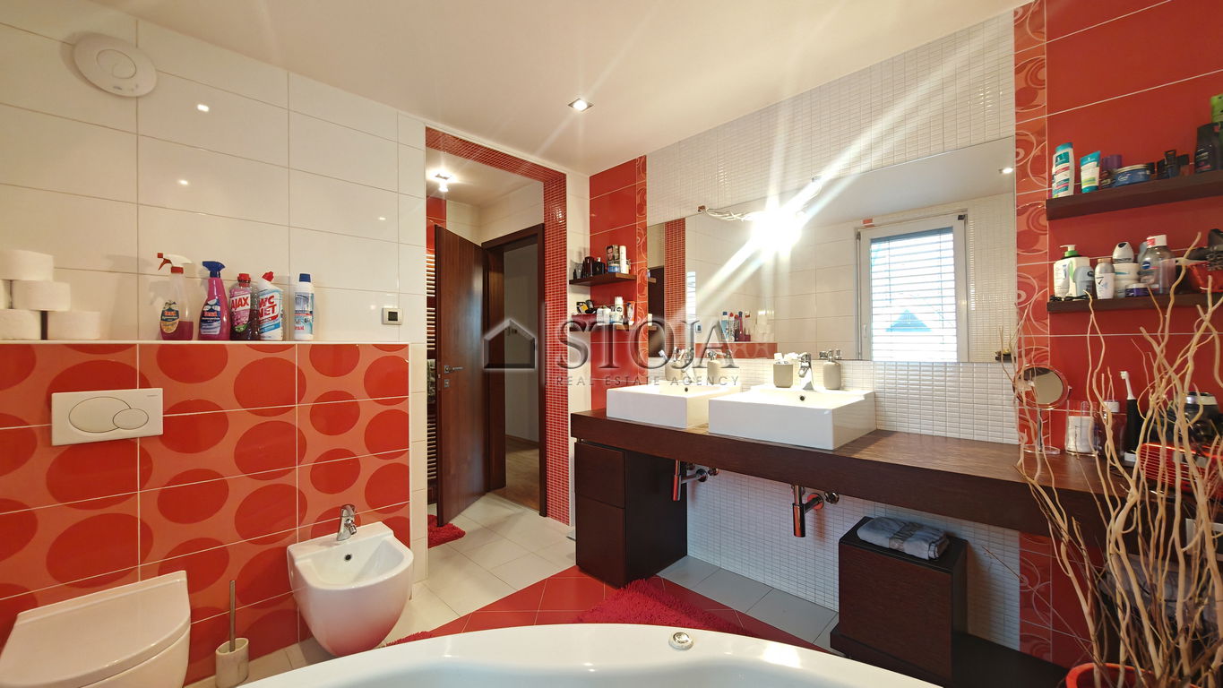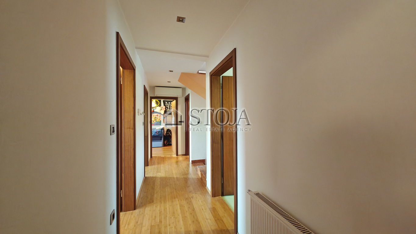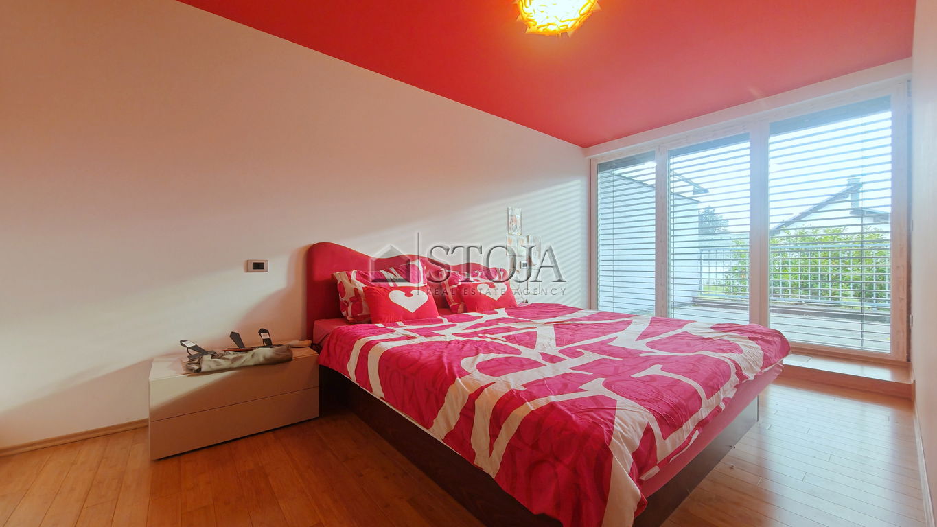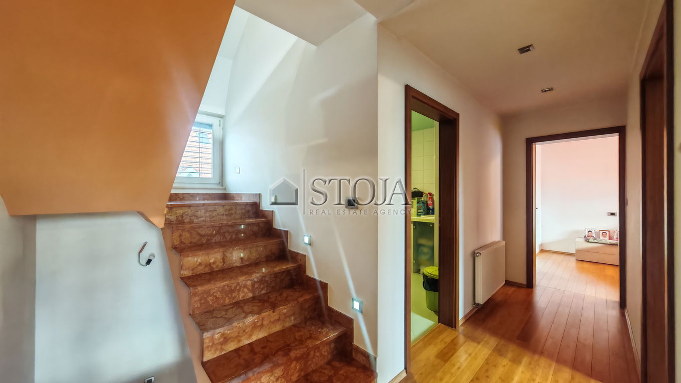 V nadstropju se nahajajo 3 prostorne mladinske sobe, utiliti ter velika kopalnica z masažno kadjo in tušem s Turško savno. V nadaljevanju se nahaja še glavna spalnica z izhodom na teraso in walk-in garderobo.