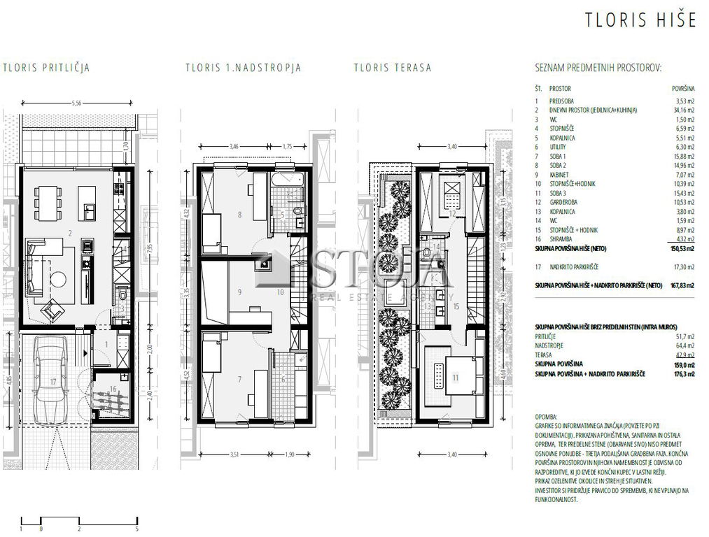 Hiša obsega 150,50 m2 uporabne površine, 17,30 m2 garaže v hiši, 15,60 m2 dodatno zunanje parkirno mesto ter zbirališče smeti ter zemljišča velikosti 167,9 m2.